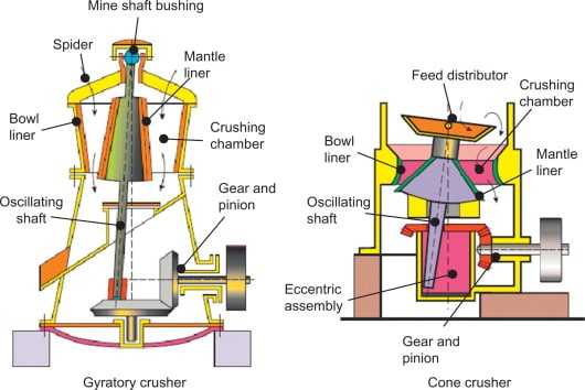 The cone crusher is a modified gyratory crusher. The essential difference is that the shorter spindle of the cone crusher is not suspended, as in the gyratory, but is supported in a curved, universal bearing below the gyratory head or cone. Power is transmitted from the source to the countershaft to a V-belt or direct drive. The countershaft has a bevel pinion pressed and keyed to it and drives the gear on the eccentric assembly. The eccentric assembly has a tapered, offset bore and provides the means whereby the head and main shaft follow an eccentric path during each cycle of rotation. Cone crushers are used for intermediate and fine crushing after primary crushing. The key factor for the performance of a cone type secondary crusher is the profile of the crushing chamber or cavity. Therefore, there is normally a range of standard cavities available for each crusher, to allow selection of the appropriate cavity for the feed material in question.